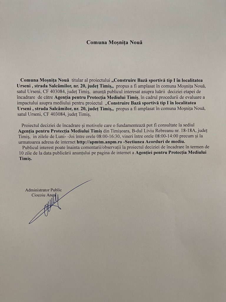 Decizie de Incadrare – Construire Baza Sportiva în localitatea Urseni