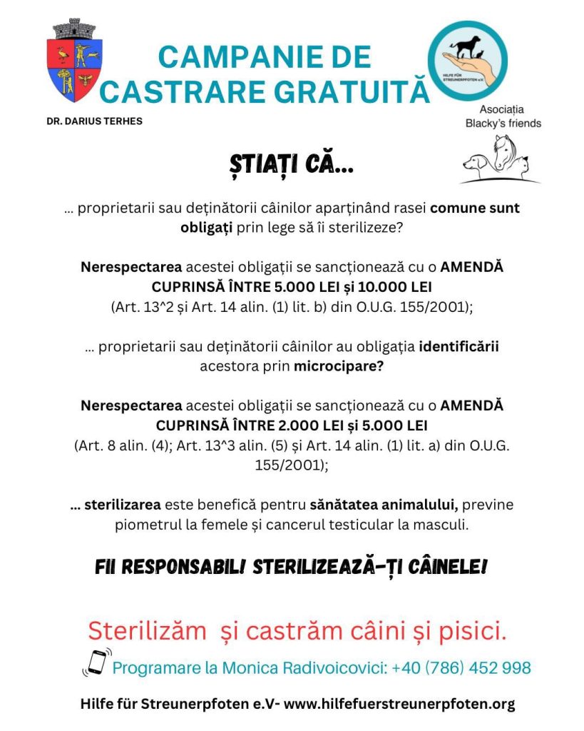 🗓️ Se vor steriliza/ castra, până la 80 de animale și au prioritate femelele care fac parte din rasa comună, din gospodării sau de pe domeniul public!