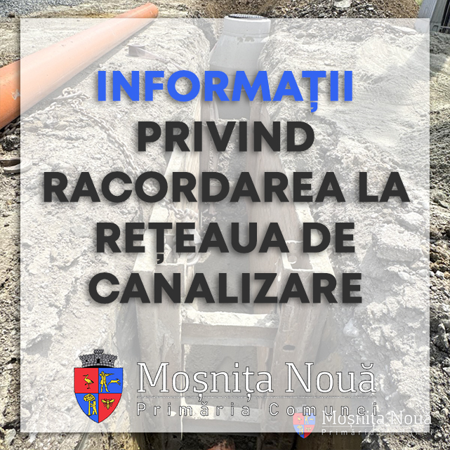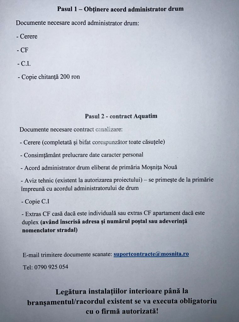 💧 Pentru racordarea la rețeaua de canalizare, vă puteți prezenta la 📍 Registratura Primăriei Comunei Moșnița Nouă în vederea obținerii acordului administratorului de drum (aviz de spargere).