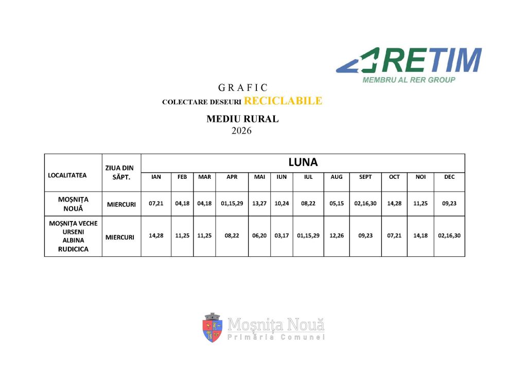 🗓️ Graficul de colectare a deșeurilor 𝐫𝐞𝐜𝐢𝐜𝐥𝐚𝐛𝐢𝐥𝐞 în 𝟐𝟎𝟐𝟔 de pe raza comunei Moșnița Nouă.
