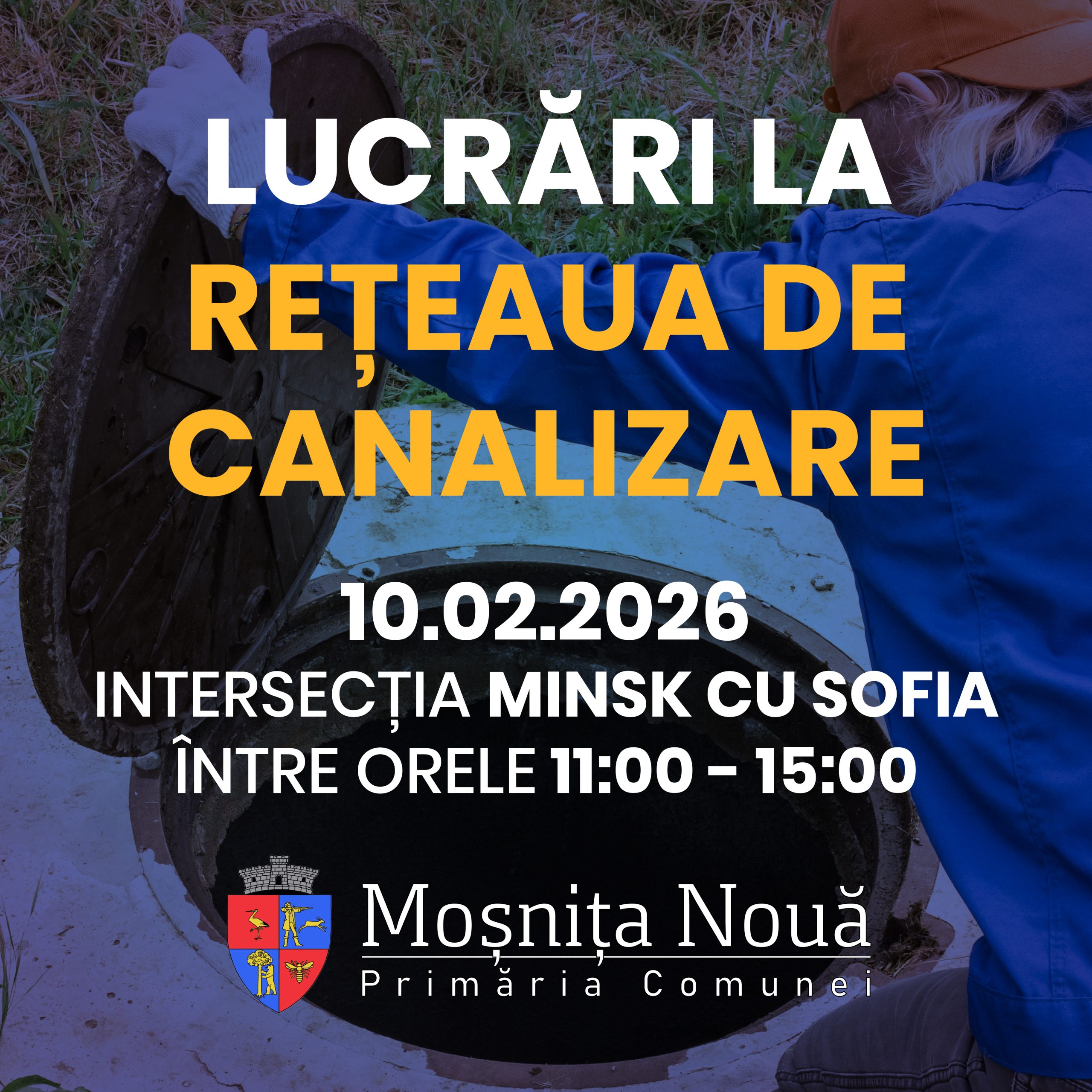 Vă informăm că mâine, 10.02.2026, în intervalul 11:00 -15:00, se vor desfășura lucrări de canalizare la intersecția străzilor Minsk cu Sofia.