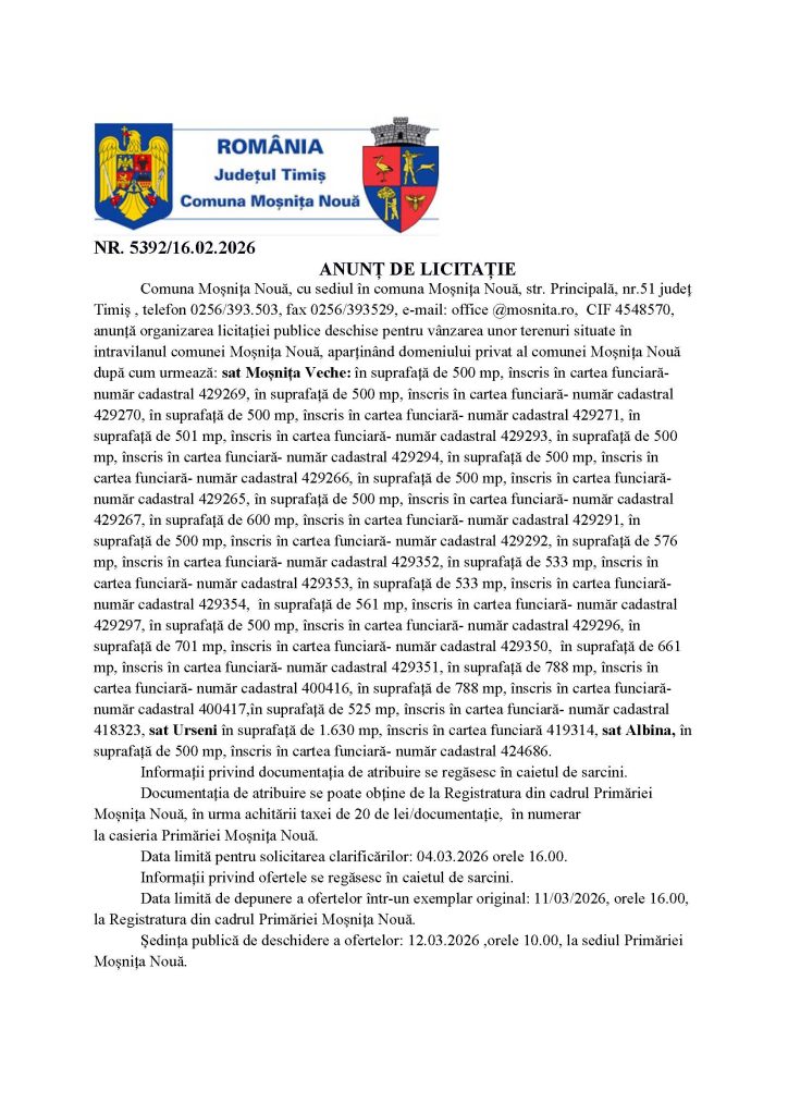 - CF 429353, 533 mp, Moșnița Veche, str. Vicențiu Babeș, preț pornire 103,95 euro (TVA 21% inclus) – https://maps.app.goo.gl/jTG4JerWTy3iqcxU9, 45°43’45.5″N 21°19’35.9″E;