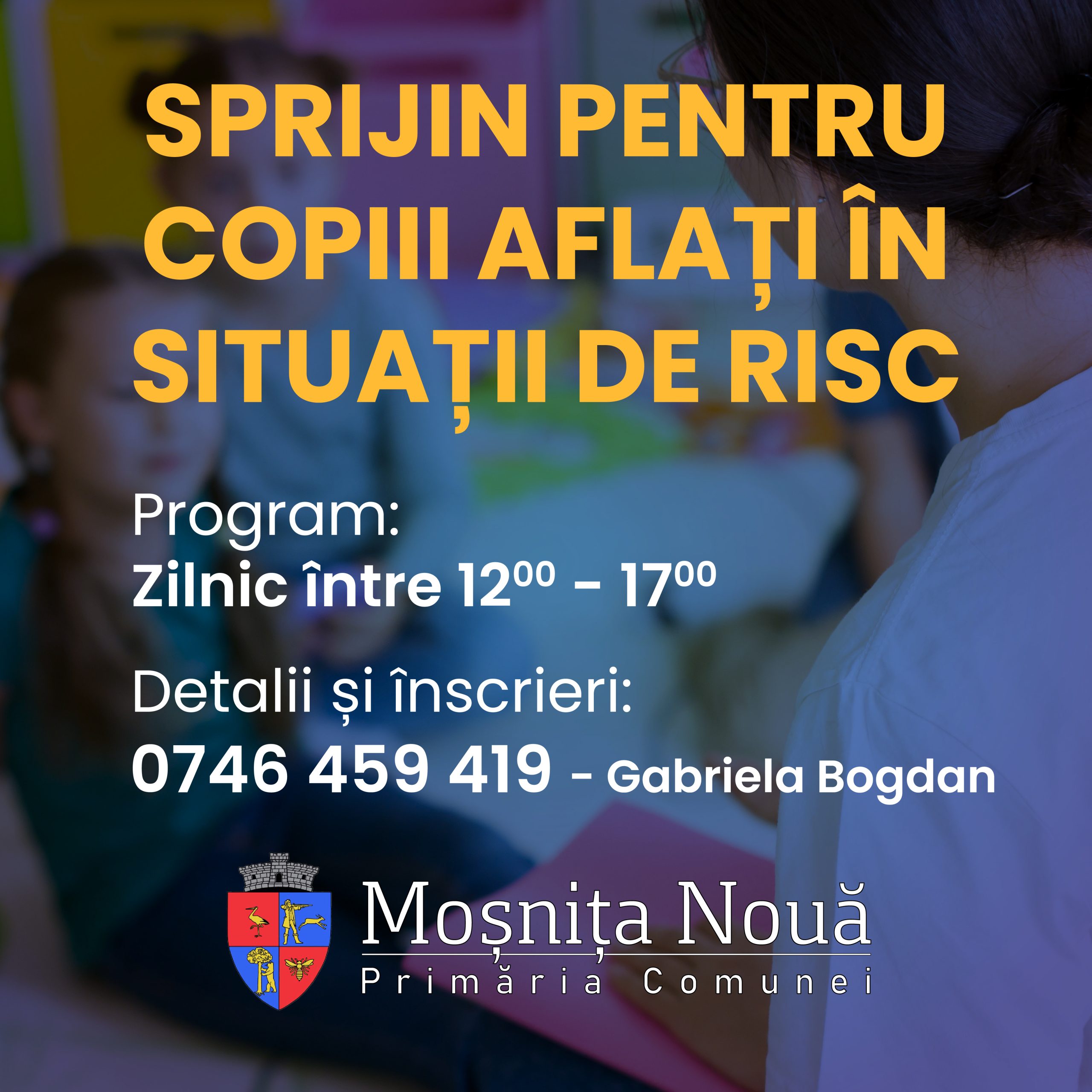 ℹ️ ANUNȚ – IDENTIFICARE COPII / ÎNSCRIERI Anunțăm deschiderea Centrului de zi pentru copii aflați în situații de risc de separare de părinți, în 📍 Comuna Moșnița Nouă (Centrul se va deschide pe parcursul lunii februarie). În cadrul centrului vor fi incluși 𝟒𝟏 𝐝𝐞 𝐜𝐨𝐩𝐢𝐢, care se află în una sau mai multe dintre următoarele […]